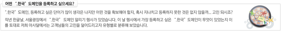 “청첩장.한국”, “돐잔치.한국”, “선영아사랑해.한국”, “자기야사랑해.한국”, “우리결혼하자.한국”, “백일.한국”, “결혼합니다.한국”, “연인사이.한국” 등 반짝이는 이벤트형 도메인 등록으로 그 도메인의 주인공이 되십시오.